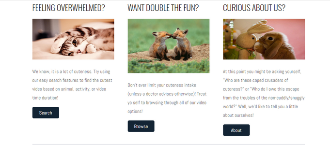The final project for my Database Management was to create, in a group, a functioning database on a subject of our choice. Deciding to select a topic that would keep us engaged, our group chose to create a database of cute animal videos that users could search by animal and video length.